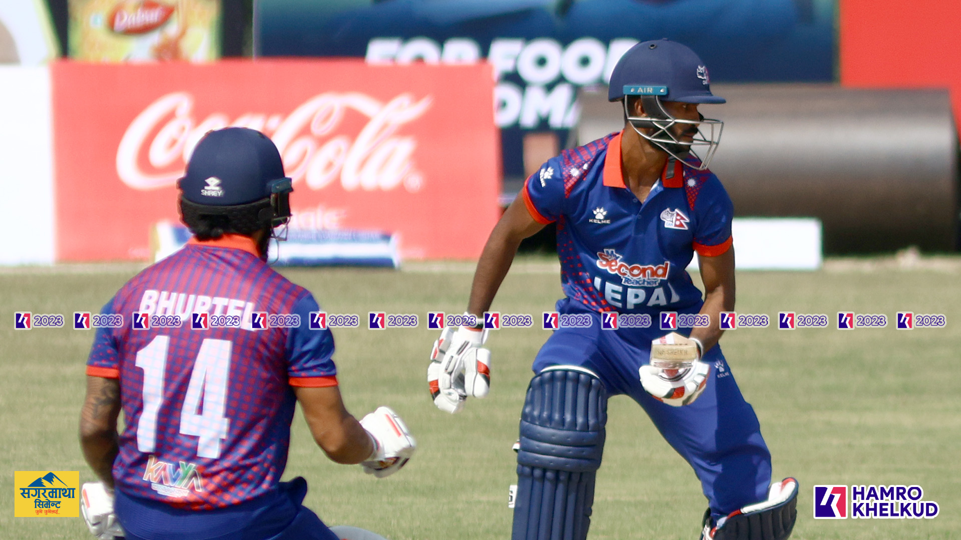 ओपनर आसिफ शेखले ३४ बलमा ६ चौकासहित सर्वाधिक ४२ रन बनाए । स्पिनर एहसान खानको बलिङ सामु नेपालका शीर्षक्रमका ब्याटरले संघर्ष गरेका थिए । खानको चौथो ओभरको दोस्रो बलमा कुशल भुर्तेल ८ रनमा बोल्ड आउट भए ।