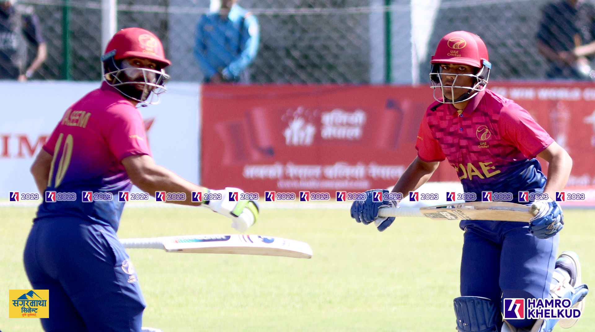 नेपाललाई ओपनर आसिफ शेख र कुशल भुर्तेलले ५ ओभरमा ४३ रन जोड्दै राम्रो सुरुवात दिलाएका थिए । स्पिनर आयन खानले पाँचौं ओभरको अन्तिम बलमा आसिफ शेखलाई ७ रनमा बोल्ड आउट गर्दै युएईलाई पहिलो सफलता दिलाएका थिए । आयनले सातौं ओभरको चौथो बलमा कुशल मल्ललाई एक रनमा बोल्ड आउट गरे ।