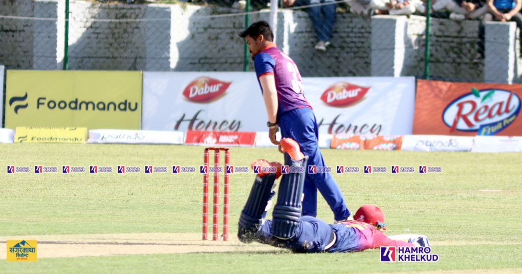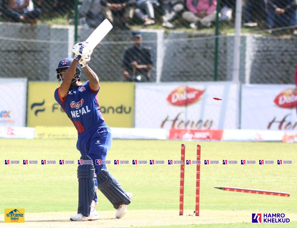 तर तीव्र गतिका बलर अली नासिरको १३ औं ओभरको पहिलो बल रोहितले प्याडल सर्ट खेल्ने धुनमा चोभार एन्डमा विकेटकिपर अर्यांश शर्माबाट क्याच आउट भएका थिए । बल अपेक्षा भन्दा कम उठ्दा रोहित क्याच आउट हुनु परेको थियो । चौथो बलमा दीपेन्द्र बोल्ड आउट भए । नासिरको इनस्वींग बलमा दीपेन्द्र बोल्ड आउट हुन पुगेका थिए ।
