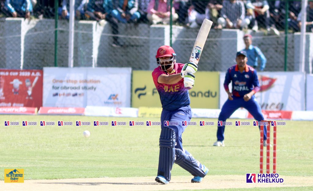 अर्कोतर्फ युएईले ब्याटिङमा ड्रिम सुरुवात गर्यो । पहिलो बल नै सोमपाल कामीले नो बल गरेका थिए । बलिङ गर्नेक्रममा खुट्टाले स्टम्प लागेपछि नो बल भएको थियो । फ्रि हिट बलमा छक्का र त्यसपछि लगातार दुई चौका वासिमले प्रहार गरेका थिए ।
