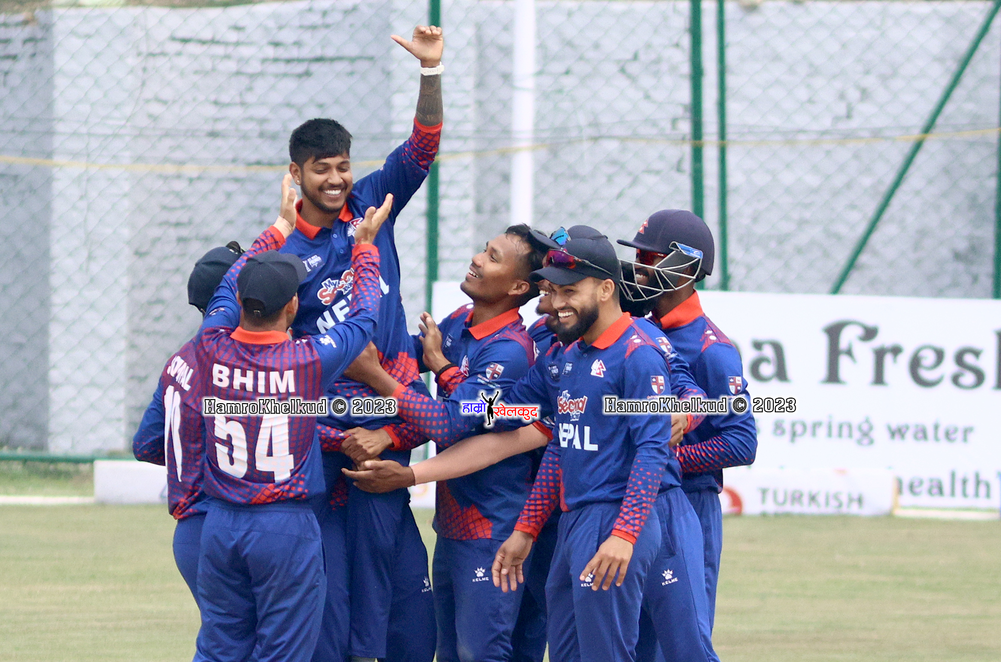 रोहित पौडेल (कप्तान), कुशल भुर्तेल, आसिफ शेख, कुशल मल्ल, दीपेन्द्रसिंह ऐरी, सन्दीप जोरा, गुलशन झा, सोमपाल कामी, करण केसी, अभिनाश बोहरा, प्रतिश जि.सी, विवेक यादव, सन्दीप लामिछाने, ललित राजवंशी र विनोद भण्डारी ।