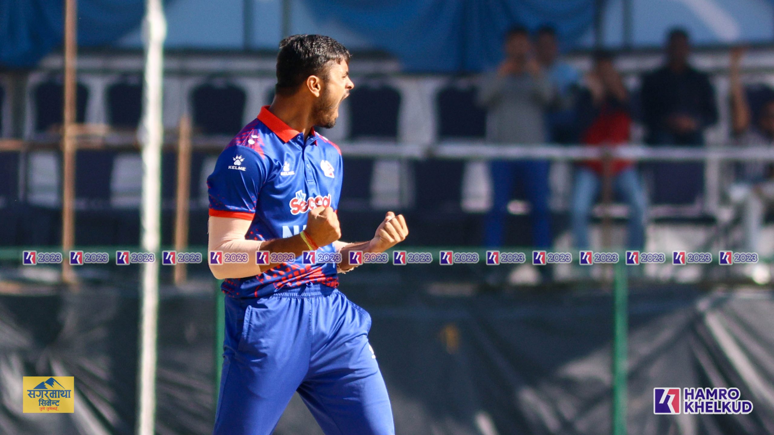 ११ औं ओभरको दोस्रो बलमा सन्दीपले सिंगापुरका अलराउन्डर जनक प्रकाशलाई ७ रनमा एलबीडब्लू आउट गरे । एक समय १०.२ ओभरमा ७०–५ को अवस्थामा पुगेको सिंगापुरलाई विकेटकिपर मनप्रीत सिंह र अर्यावीर चौधरीले छैटौं विकेटका लागि ४६ रनको साझेदारी गरेका थिए ।