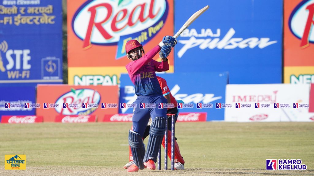 युवा स्पिन अलराउन्डर मितले १५ औं ओभरको पहिलो बल बासिल हामिदलाई डट राखेका थिए । मुलपानी एण्डबाट आएको दोस्रो बल बासिलले छक्का हान्दै युएईलाई पाँच विकेटको जित दिलाए । अफ स्टम्पतर्फ फ्याँकेको बललाई बासिलले डिप मिडविकेटतर्फ छक्का प्रहार गरे । मुलपानी मैदानको दर्शक बस्ने ठाउँतर्फ गरिएको उक्त विशाल प्रहारसँगै खेल पनि सकियो ।