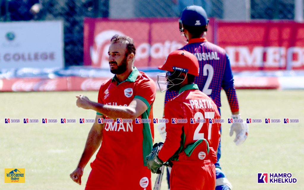 स्पिनर सकिल अहमदको पाँचौं ओभरको पाँचौं बलमा सोमपाल कामी १२ रनमा एक्स्ट्रा कभरमा अकिब इलियासबाट क्याच आउट भए । सोमपालले ९ बलमा १ चौका र १ छक्कासहित १२ रन बनाए ।