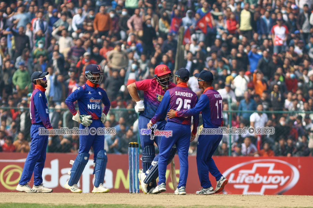 जितको लागि १ सय ७६ रनको विजयी लक्ष्य पछ्याएको नेपाल सुरुवात नै सम्झन लायक थिएन । तीव्र गतिका बलर जहुर खान र जुनैद सिद्दिकले १४–३ को अवस्थामा पुर्याएका थिए । त्यसपछि कप्तान अहमद राजाले ५ विकेट लिँदै नेपाललाई १ सय ७ रनमा अल आउट गर्दै विश्वकप सपना समाप्त पारेका थिए ।