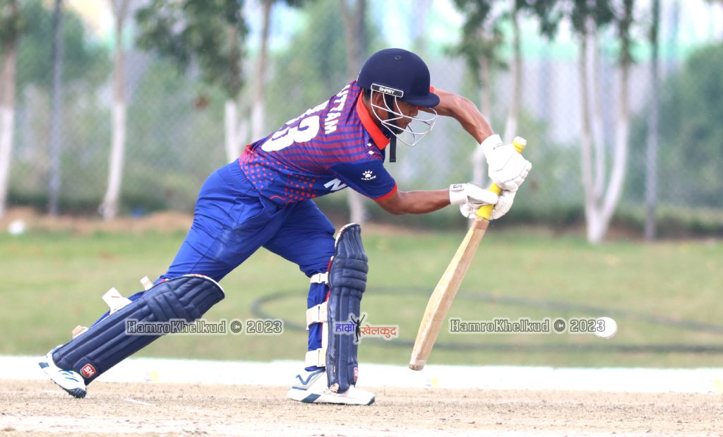 कप्तान देव खनाल १३ बल खेल्दा खाता खोल्न सकेनन् । मोहम्मद जिशानको १२ औं ओभरको पाँचौं बलमा ठूलो सर्ट खेल्ने धुनमा टप एज लागेर देव अली असफन्दबाट क्याच आउट भएका थिए ।