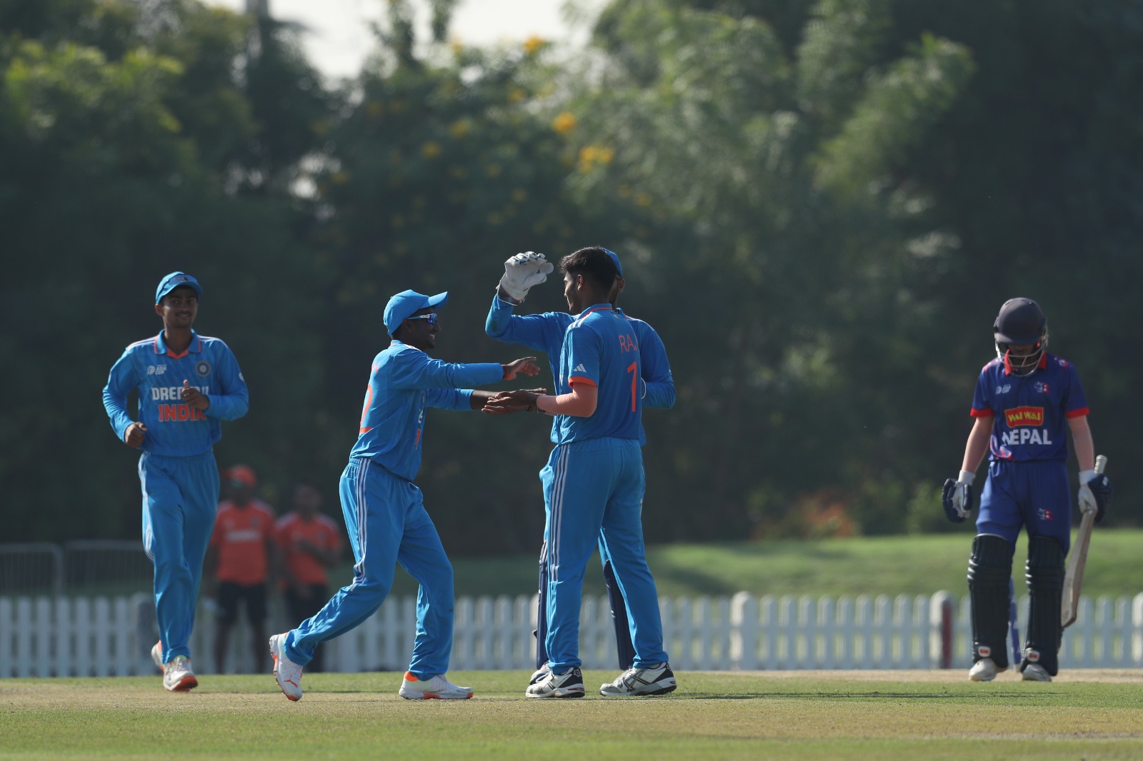 भारतका तीव्र गतिका बलर राज लिम्बानीले ९.१ ओभरमा ३ मेडनसहित १३ रन खर्चेर ७ विकेट लिए । शुक्लाको नाममा २ विकेट रह्यो । नेपाल पहिलो खेलमा पाकिस्तानसँग ७ विकेट र दोस्रो खेलमा अफगानिस्तानसँग ७३ रनले पराजित भएको थियो ।