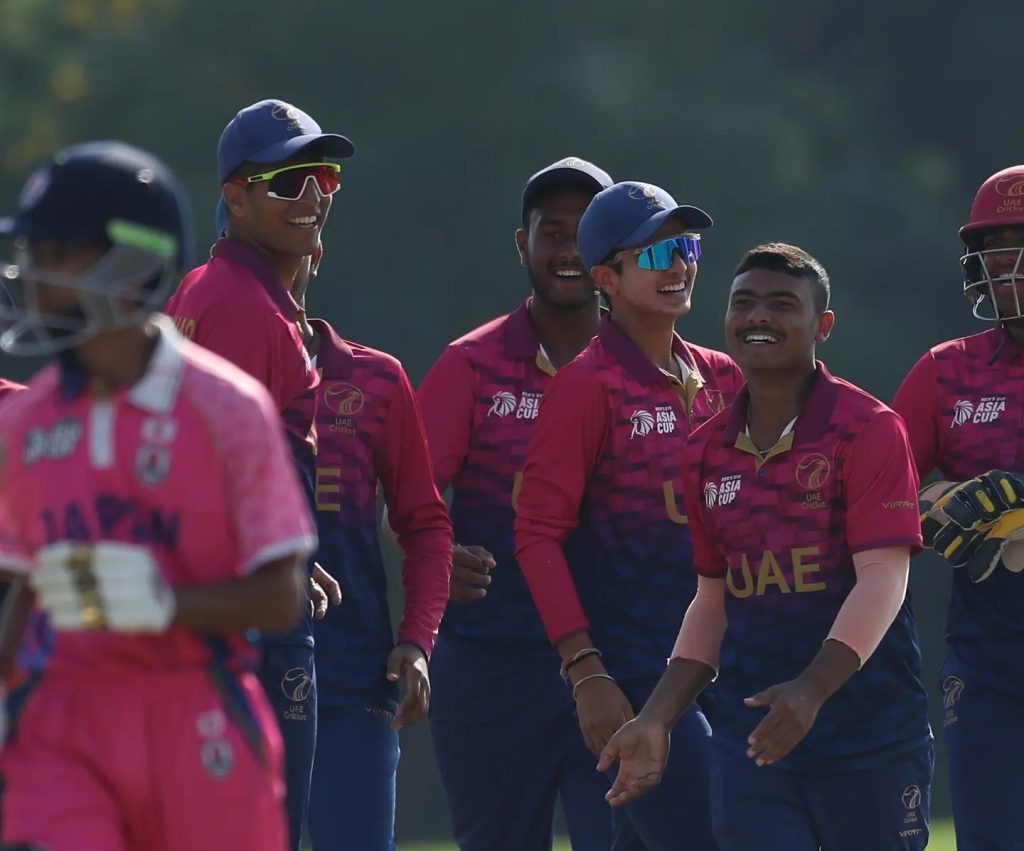 त्यसअघि टस जितेर पहिला ब्याटिङ रोजेको युएईले निर्धारित ५० ओभरमा ७ विकेट गुमाउँदै ३ सय २० रन बनाएका थियो । युएईका आयन खानले ४१ बलमा ६ चौका र ३ छक्कासहित सर्वाधिक ६७ रनमा नट आउट रहे । ध्रुब परेशार ६५, मरुफ मेरचान्ट ६० र तनिश सुरी ४३ रनमा आउट भए । जापानका आराव तिवारी र चाल्र्स हिन्जाले २–२ विकेट लिए ।