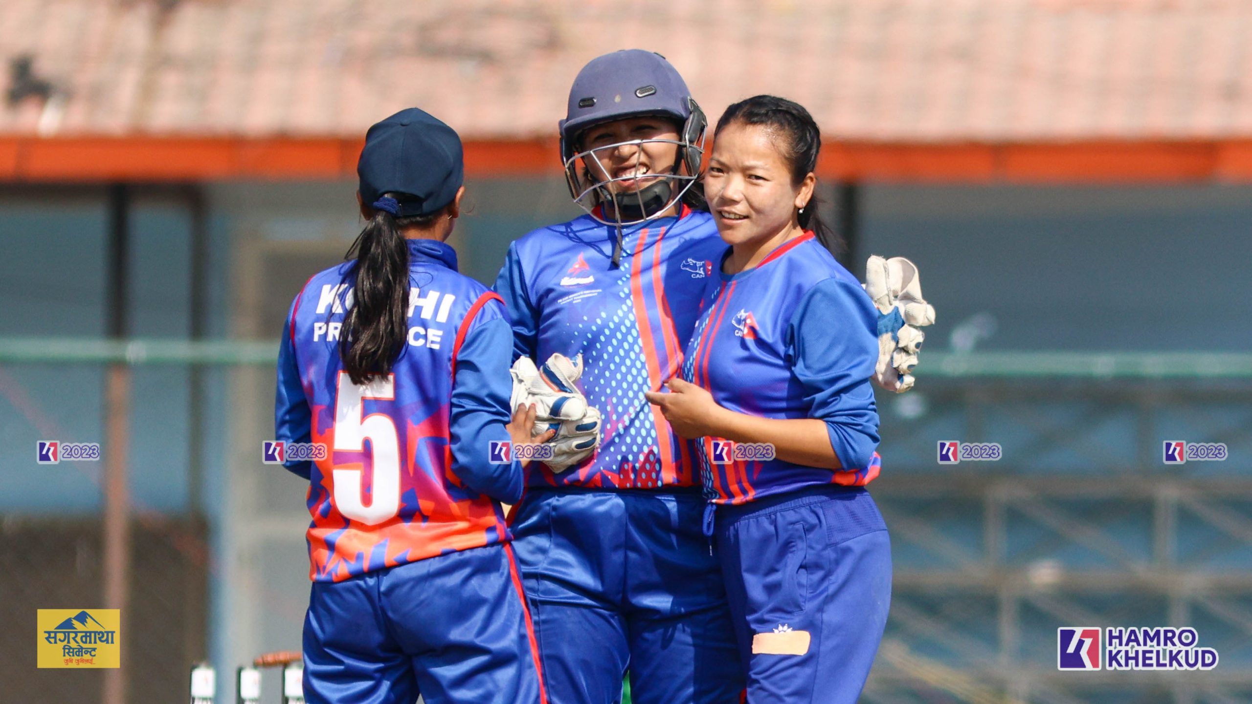 अनु कडायत र लक्ष्मी साउदले ७-७ रन बननाए । सावित्री धामीले २ र ऋतु कनौजिया शून्यमा आउट भइन् । कोशीको लागि संगिता राईले ४ ओभरमा १३ रन खर्चेर २ विकेट लिइन् । सबनम राई, एलिसा खडिया र निशा शाहले १-१ विकेट लिइन् ।