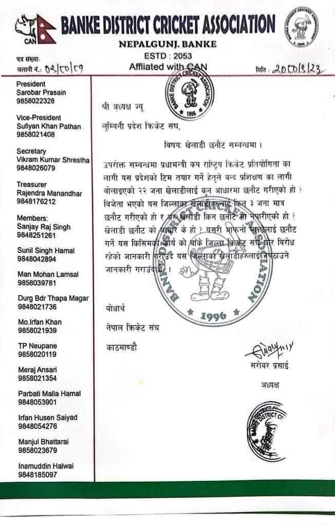 ‘बन्द प्रशिक्षणमा बोलाएको २२ जना खेलाडी कुन आधारमा गरिएको हो ? च्याम्पियन बाँकेबाट तीन मात्रै खेलाडी र अरु खेलाडी किन नपरेको हो ? खेलाडी छनोटको आधार के हो ? यसरी आफ्नो मान्छेलाई छनोट गर्ने किसिमको कार्य बाँकेले विरोद गर्दै खेलाडीलाई बन्द प्रशिक्षणमा नपठाउने निर्णय गरेका छौं’, बाँके जिल्ला क्रिकेट संघका अध्यक्ष सरोवर प्रसाईले एक प्रेस विज्ञप्तिमा भनेका छन् ।