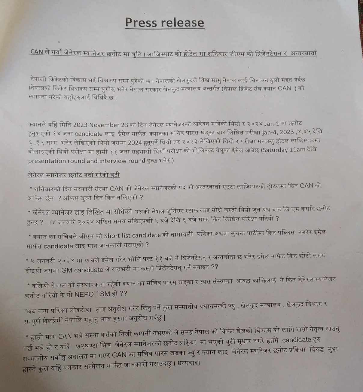 ११ मध्येबाट ७ जनाको अन्तवार्ता लिएको र त्यसबाट ढुंगानालाई छनोट गरिएको बताइएको छ । क्यानका सचिव खड्का बलियो नेपालको सस्थापक रहेको र सोही संस्थानमा आबद्ध व्यक्तिलाई महाप्रबन्धक नियुक्त गरिनुमा प्रश्न गरेका छन् ।
