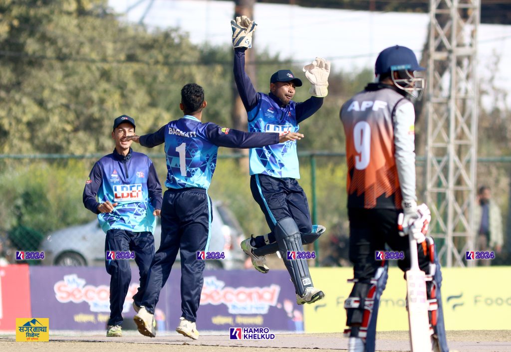 टियु एण्डबाट आएका स्पिनर सूर्य तामाङले १३ औं ओभरमा दुई विकेट लिएपछि एपीएफ संकटमा पुगेको छ । दोस्रो बलमा सुमित महर्जन ६ रनमा एलबीडब्लू आउट भए । दुई बलपछि पुरन बिकलाई शून्यमा बोल्ड गरेपछि एपीएफ १२.४ ओभरमा ४१–५ को दयनीय अवस्थामा पुगेको थियो ।