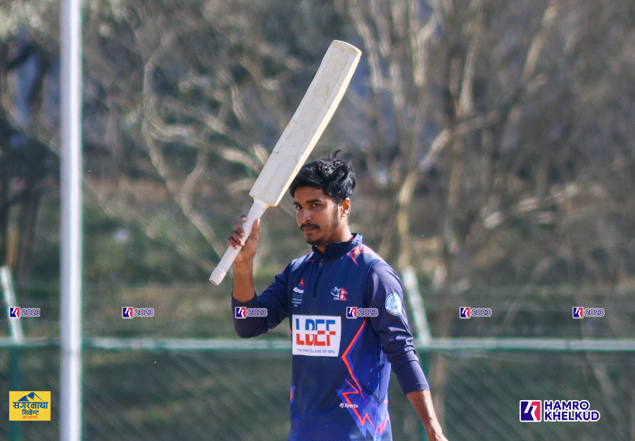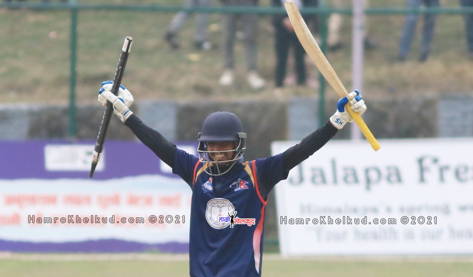नेपाल एपीएफ क्लबका ब्याटर सन्दीप जोराले बागमतीविरुद्ध पाँचौं नम्बरमा आउँदै १ सय १७ बलमा ७ चौका र ५ छक्कासहित १ सय १२ रन बनाउँदै करिअरकै पहिलो शतक हानेका थिए ।