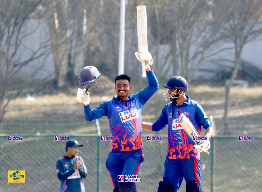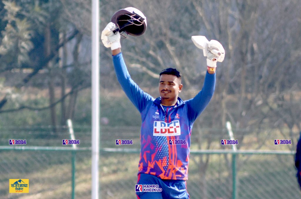 उनले ४४ औं ओभरको पाँचौं बलमा सागर ढकाललाई चोभार एन्डतर्फ लङअनमा छक्का हान्दै आफ्नो करिअरको पहिलो शतक पूरा गरेका थिए । उनले १ सय १९ बलमा शतक पूरा गरेका थिए ।