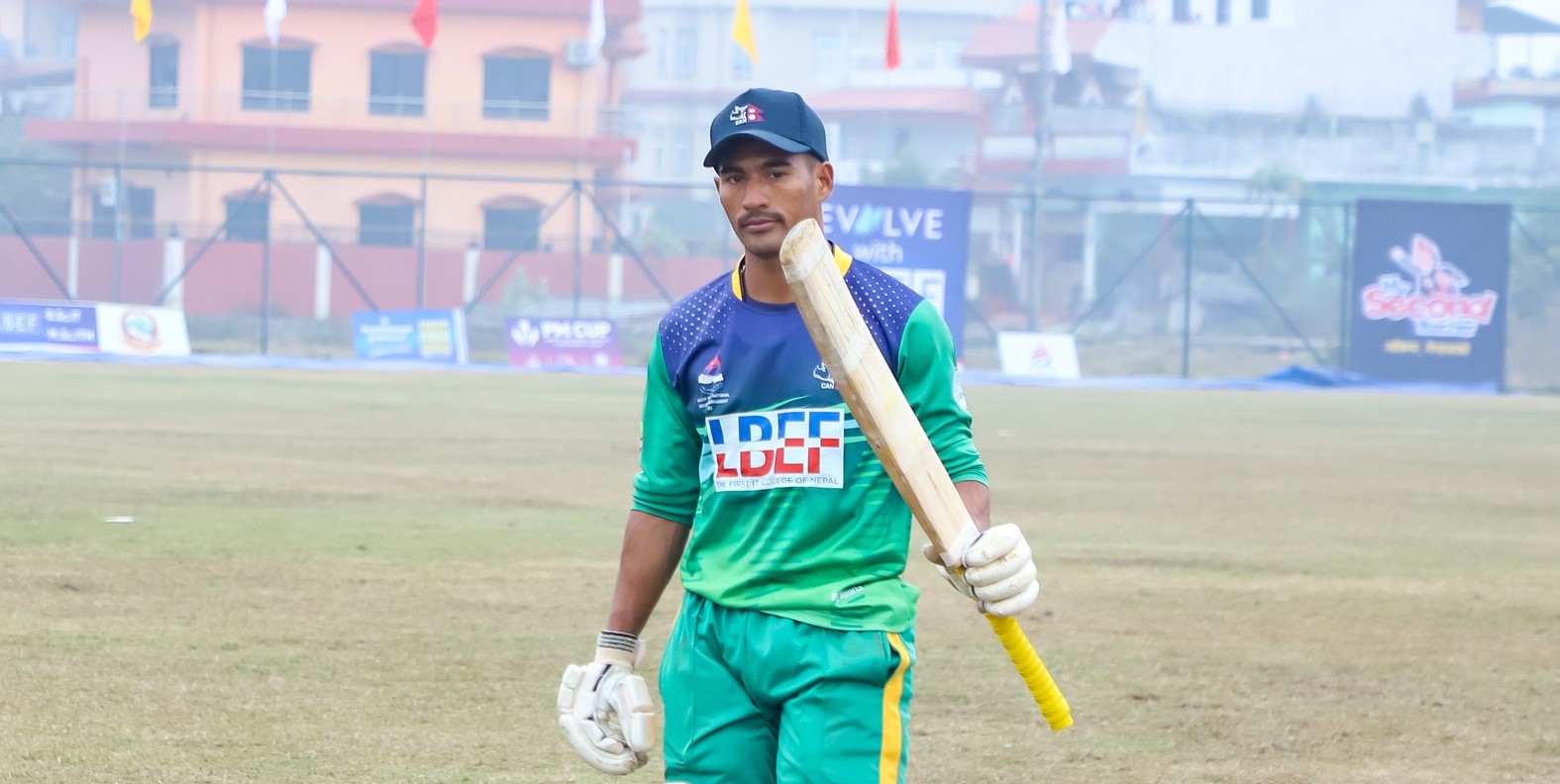 किरण ठगुन्ना ३३ बलमा ५ चौका र २ छक्कासहित ५० रनमा रन आउट भए । राजु रिजाल १९ र नरेश भट्ट १५ रनमा आउट भए । कर्णालीका दीनेश अधिकारी, युनिस सिंह, प्रकाश जैसी र दीपेन्द्र रावतले १–१ विकेट लिए ।