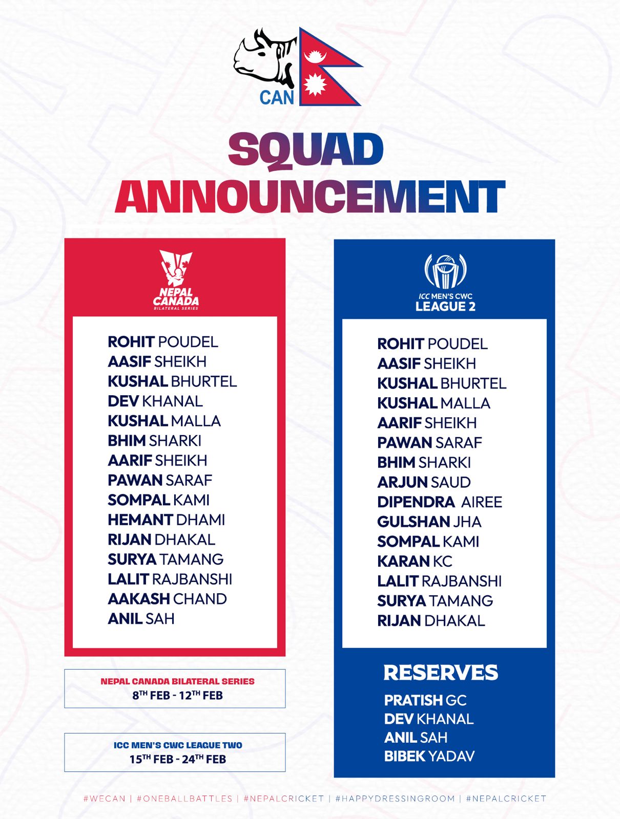 क्यानडा सिरिज : रोहित पौडेल, आसिफ शेख, कुशल भुर्तेल, देव खनाल, कुशल मल्ल, भीम सार्की, आरिफ शेख, पवन सर्राफ, सोमपाल कामी, हेमन्त धामी, रिजन ढकाल, सूर्य तामाङ, ललित राजवंशी, आकाश चन्द, अनिल शाह