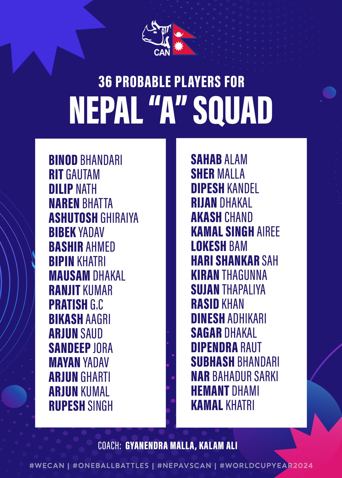 सिनियर टोलीसम्म पुग्ने बाटोको रुपमा रहने टोलीमा प्रधानमन्त्री कप र राष्ट्रिय टोलीमा यसअघि गरेको प्रदर्शनको आधारमा खेलाडी छनोट गरिएको छ । नेपाल ए को सम्भावित सुचिमा ३६ खेलाडी समावेश गरिएको छ ।