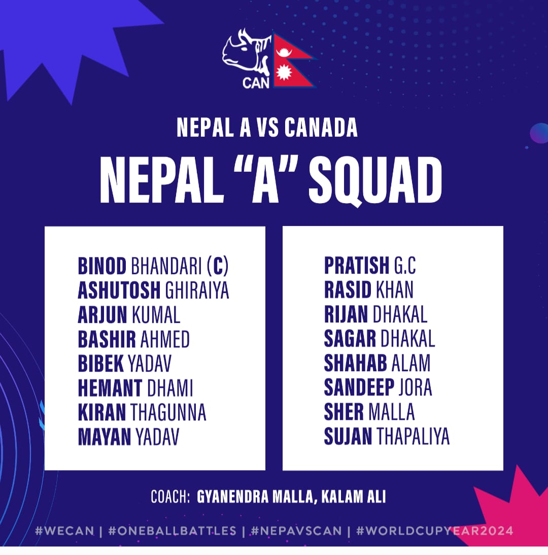 नेपाल ‘ए’ ले लिग-२ को तयारीका लागि नेपाल आइपुगेको क्यानडासँग मैत्रीपूर्ण सिरिज खेल्ने कार्यक्रम रहेको छ । उक्त सिरिजका लागि भने १६ सदस्यीय टोली छनोट भएको छ ।