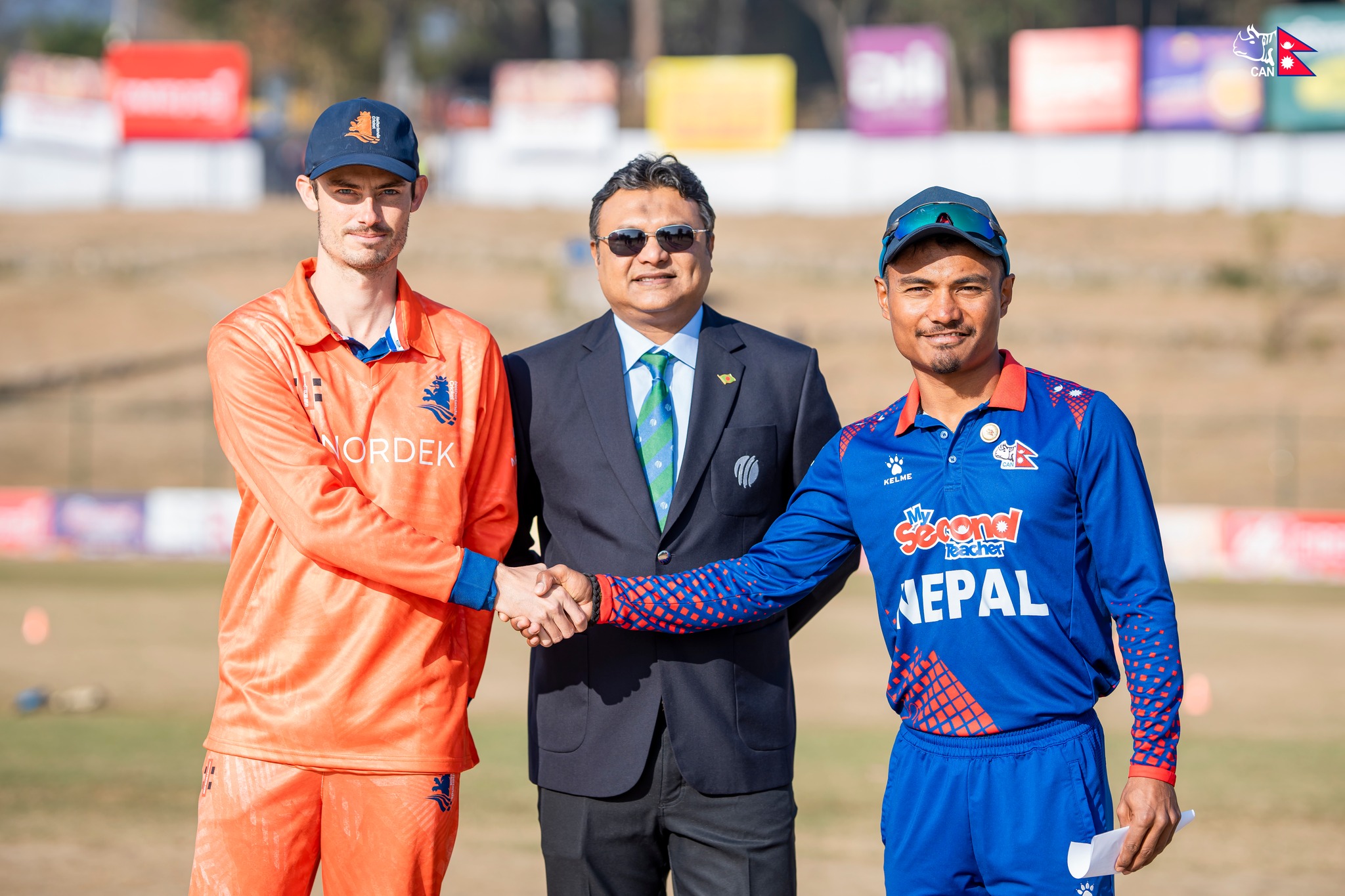 नेदरल्यान्ड्सका कप्तान स्कट एडवार्ड्सले टस जितेर पहिलो फिल्ड गर्ने निर्णय लिएसँगै नेपालले पहिलो ब्याटिङ गर्ने भएको हो । आज नेपाली टोलीमा दुई परिवर्तन भएको छ । देव खनाल र सोमपाल कामीले विश्राम पाउँदा गुलशन झा र आरिफ शेख टोलीमा आएका छन् ।