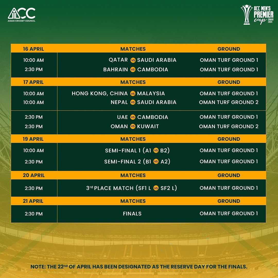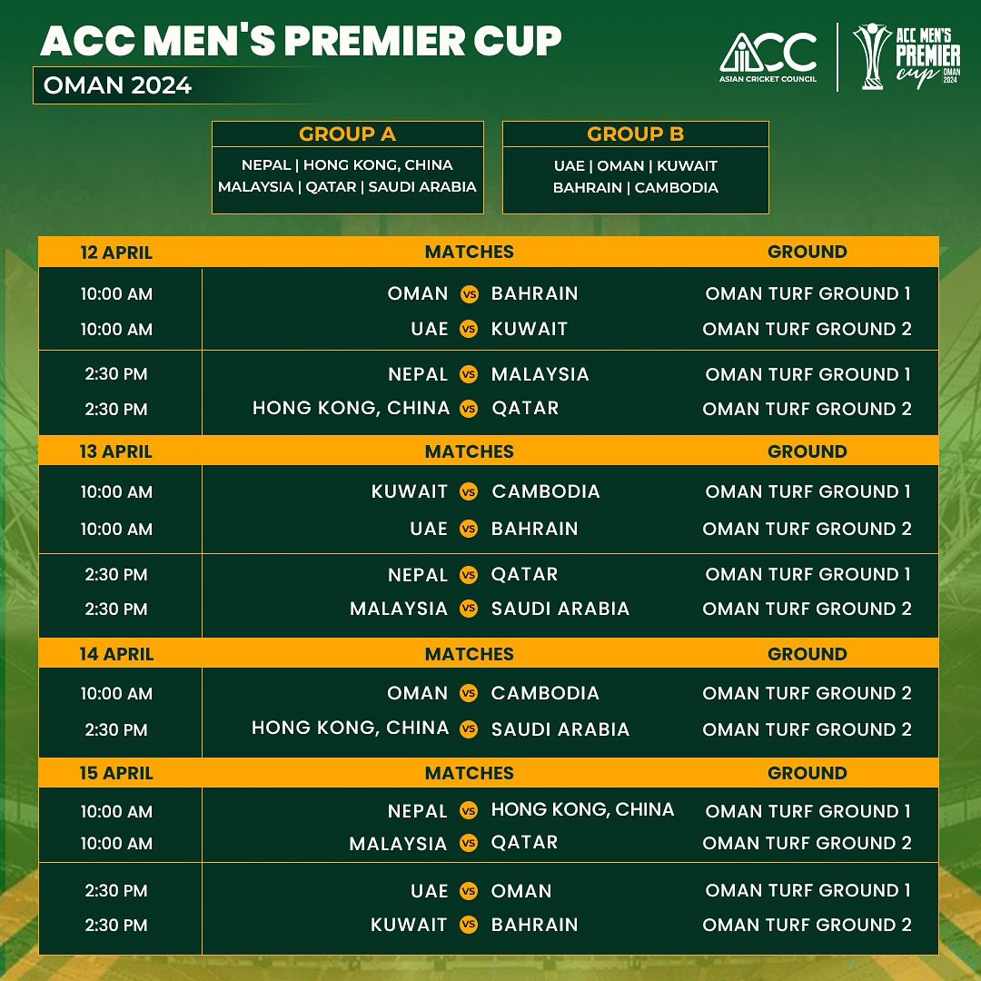 एसियाली क्रिकेट परिषद (एसीसी) ले आइतबार सार्वजनिक गरेको खेल तालिका अनुसार समूह ए मा नेपाल, हङकङ, मलेसिया, कतार र साउदी समूह ए मा रहेका छन् । समूह बी मा यूएई, ओमान, कुवेत, बहराइन र कम्बोडिया रहेका छन् ।