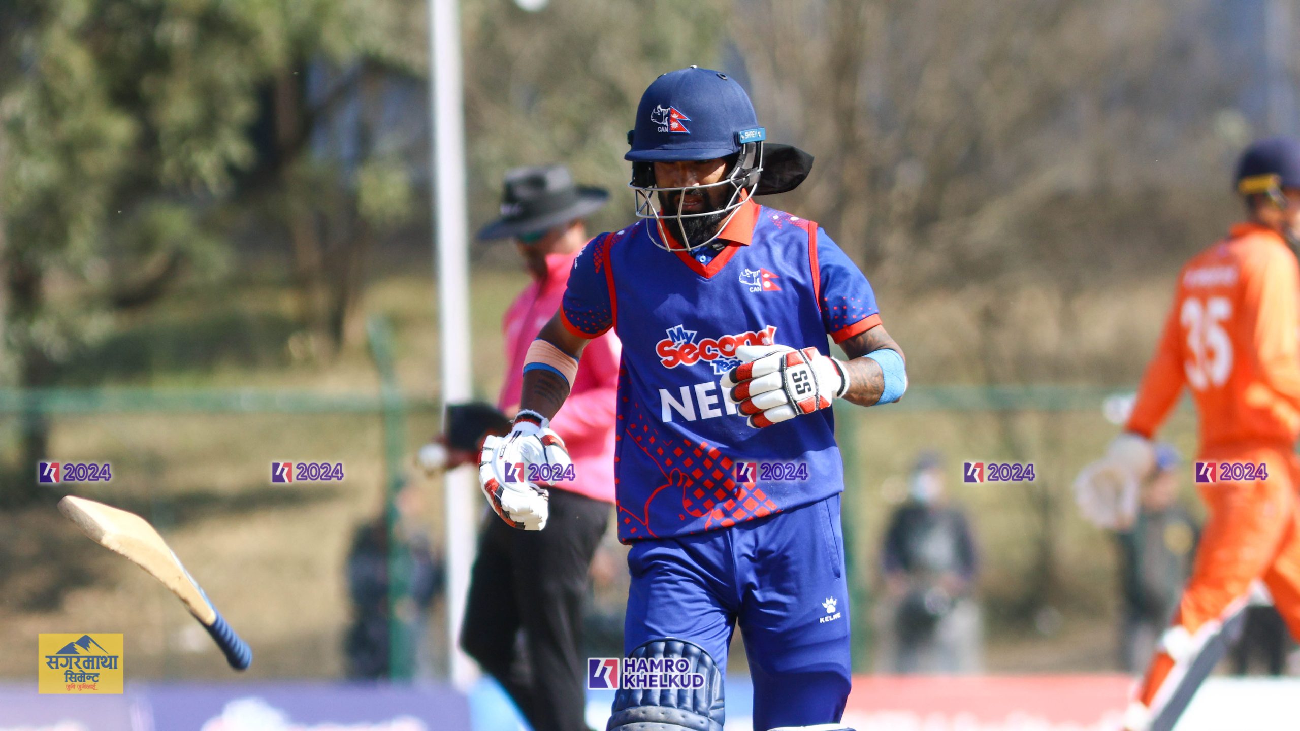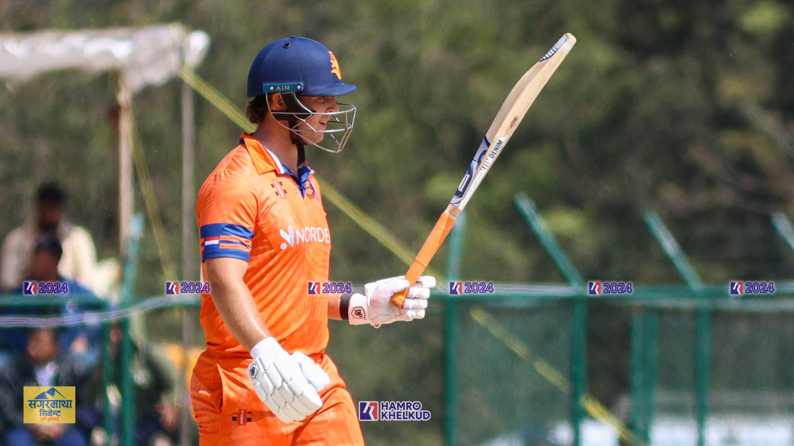 ओपनर कुशल भुर्तेल इनिङको तेस्रो बलमा खाता नखोली कट बिहाइन्ड भए । दोस्रो विकेटका लागि आसिफ शेख र रोहित पौडेलले ६५ रनको साझेदारी गरे । आसिफ २३ बलमा ४ चौका र १ छक्कासहित ३४ रन जोडेर आउट भए । आठौँ ओभरको पहिलो बलमा भान डर मर्वलाई आक्रमण गर्ने धुनमा उनी स्टम्प आउट भए ।