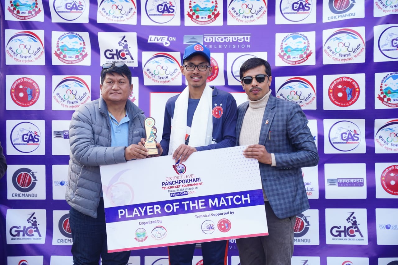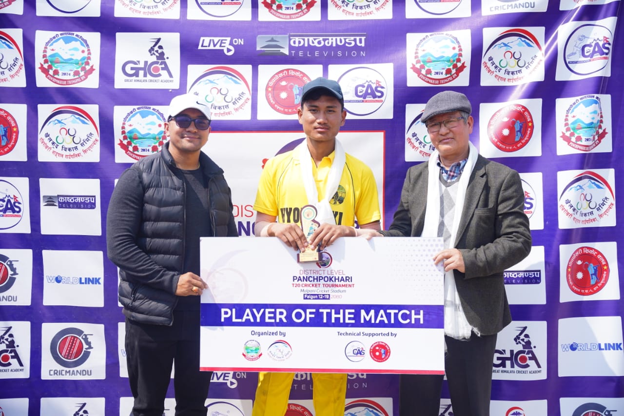 ओपनरद्वय विनोद तामाङ र नाम्गिल शेर्पाले १० ओभरमै विजयी लक्ष्य पूरा गरे । प्लेयर अफ द म्याच चुनिएका विनोदले नटआउट ६० रन बनाए । उनले ३८ बलमा ९ चौका प्रहार गरे । त्यस्तै नाम्गिल २२ बलमा ३ चौकासहित २६ रनमा नटआउट रहे ।
