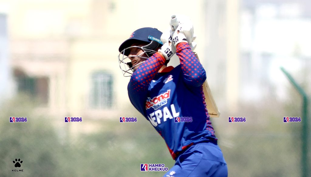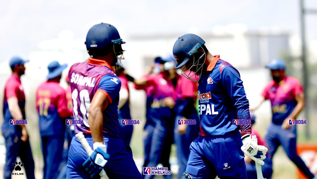 चौथो नम्बरमा ब्याटिङ गर्न आएका सन्दीप जोराले इनिङ सम्हालेर रन जोड्दा अर्कोतर्फ भने निरन्तर विकेट पतन जारी रह्यो । कुशल मल्ल ३ रनमा बसिल हमिदबाट बोल्ड भए । दीपेन्द्र सिंह ऐरी पनि ५ रनमा आयान खानको एलबीडब्लू धरापमा परे ।