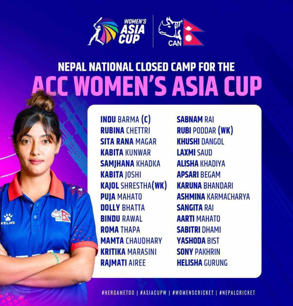 इन्दु वर्मा (कप्तान),रुविना क्षेत्री, सिता राना मगर, कविता कुँवर, सम्झना खड्का, कविता जोशी, काजोल श्रेष्ठ (विकेटकिपर) , पूजा महतो, डली भट्ट, विन्दु रावल, रोमा थापा, ममता चौधरी, कृतिका मरासिनी, सबनम राई, रुवि पोदार (विकेट किपर), खुसी डंगोल, लक्ष्मी साउद, अप्सरी बेगम, करुणा भण्डारी, अश्मिना कर्माचार्य, संगीता राई, आरती महतो, सावित्रा धामी, यशोदा विष्ट , सोनी पाख्रिन र हेलिसा गुरुङ ।