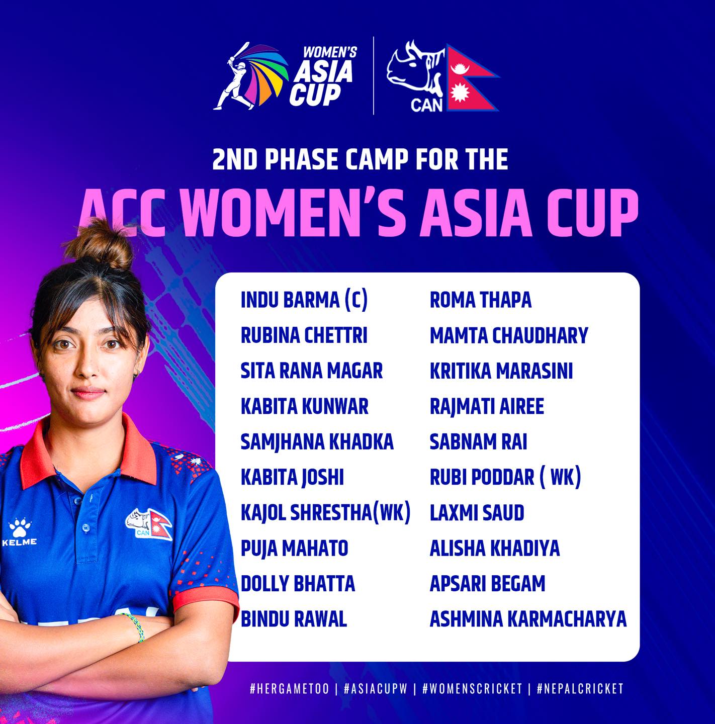 काठमाडौं (हाम्रो खेलकुद) – नेपाल क्रिकेट संघ (क्यान) एसीसी महिला एसिया कपका लागि दोस्रो चरणको बन्द प्रशिक्षणमा २०-सदस्सीय टोली घोषणा गरेको छ । क्यानले इन्दु वर्माको कप्तानीमा २० जनालाई समेट्दै दोस्रो चरणका लागि बुधबार नेपाली टोली घोषणा गरेको हो ।