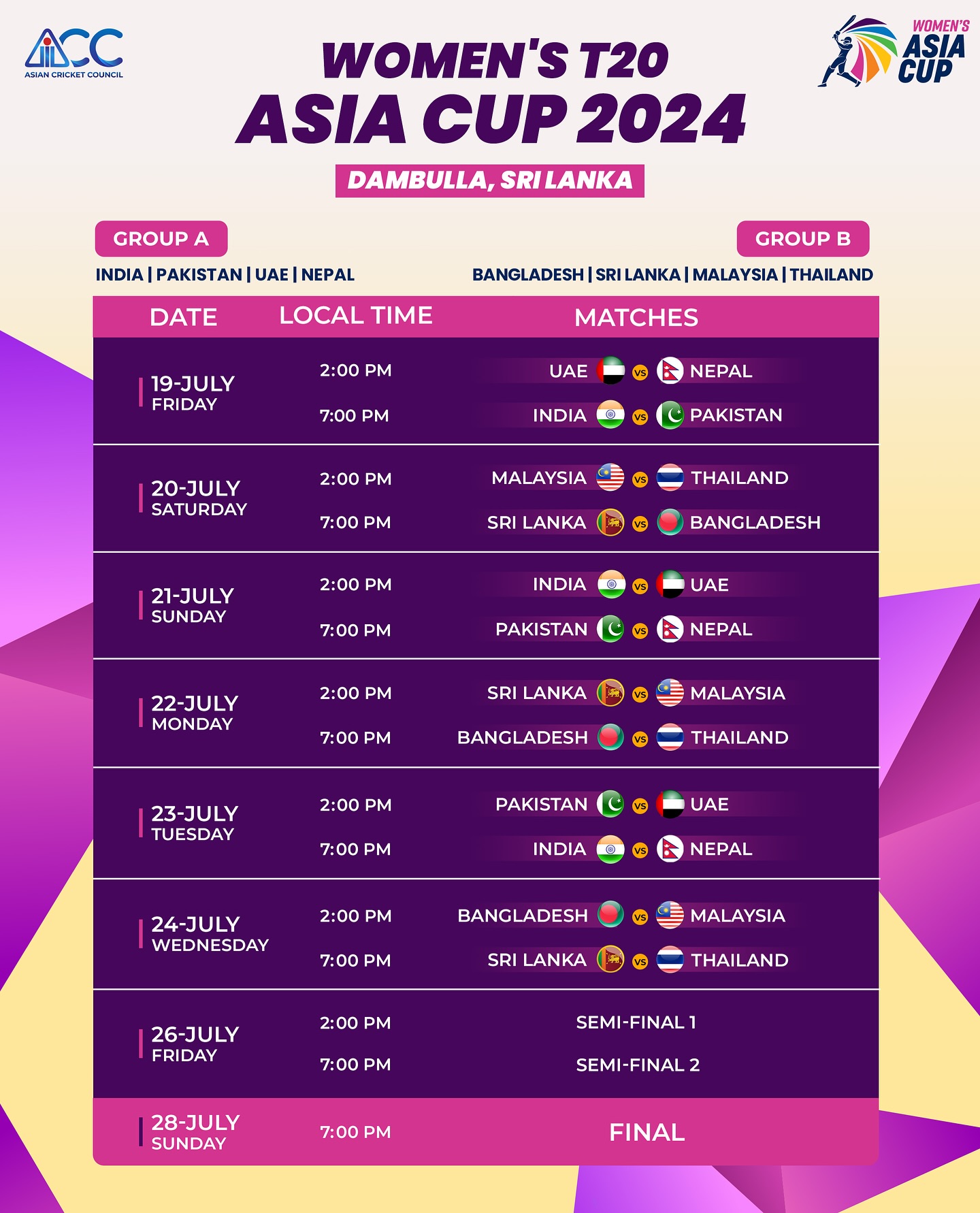 काठमाडौं (हाम्रो खेलकुद) – श्रीलंकामा आउँदो जुलाईमा हुने एसीसी महिला एसिया कप २०२४ को उद्दघाटन खेलमा नेपाल र युएई भिड्ने भएका छन् ।