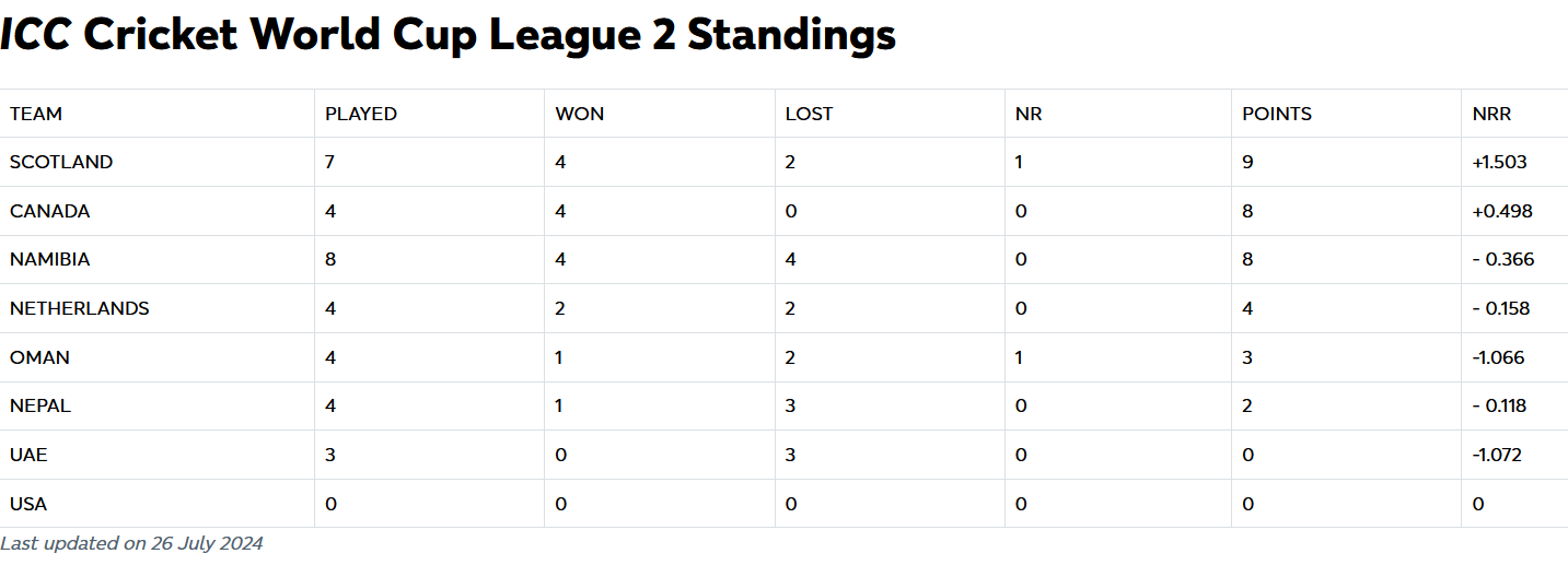 जितसँगै ८ टोली सहभागी लिग टु को अंक तालिकामा स्कटल्यान्ड ९ अंकका साथ शीर्ष स्थानमा उक्लिएको छ । ८ अंकका साथ नामिबिया तेस्रो स्थानमा छ । अंकतालिकामा २ अंकका साथ नेपाल छैटौं स्थानमा छ । लिग टुको शीर्ष चार टोलीले २०२७ हुने ओडिआई विश्वकप छनोटमा स्थान बनाउने छन् ।