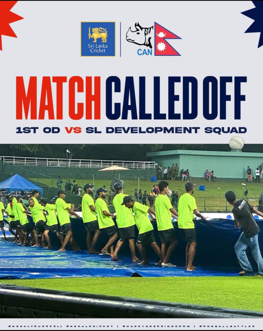 श्रीलंकामा नेपाली समय अनुसार बिहान १०ः१५ बजे सुरु हुने भनिएको खेल भारी वर्षाका कारण रद्द भएको हो । नेपालले सोही टोलीसँग बुधवार र शुक्रवार पनि अभ्यास खेल खेल्नेछ ।