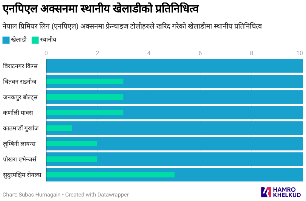 विराटनगरमा स्थानीय खेलाडीको शून्यता छाउँदा सुदुरपश्चिमले भने ठिक विपरित अक्सनमा अनुबन्ध गरेको १० मध्य ५ खेलाडी स्थानीय राखेको छ । त्यसो त अक्सनमा बिकेका ८० मध्य २२ खेलाडी सुदुरपश्चिम प्रदेशका थिए । नेपाली क्रिकेटको उर्वर भूमि सुदूरपश्चिम नै हो भन्ने कुरालाई पनि अक्सनले थप प्रमाणित गरेको छ । यहाँसम्मकी एनपिएलका सबै फ्रेन्चाइज टोलीमा कम्तिमा एकजना सुदुरपश्चिमका खेलाडी रहेका छन् ।