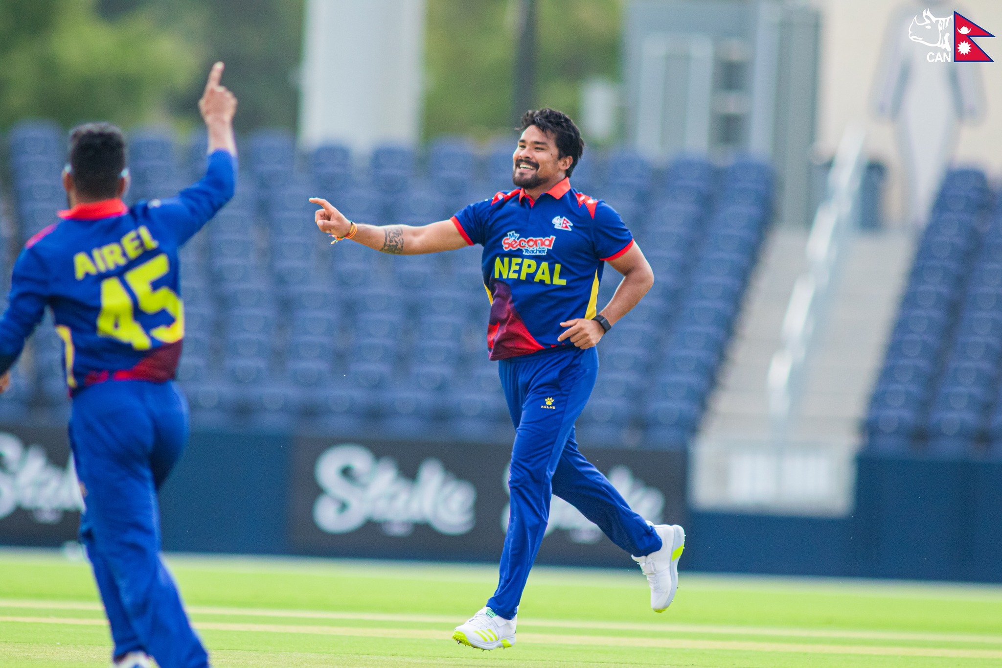 माइकल लिस्क १४, म्याथ्यु क्रस १५ र ज्याक जार्विस शून्यमा आउट भए । नेपालका सन्दीप लामिछानेले १० ओभरमा १ मेडनसहित ४५ रन खर्चेर ३ विकेट लिए । करण केसी, सोमपाल कामी र गुल्सन झाले २-२ विकेट लिए । आरिफ शेखको नाममा १ विकेट रह्यो ।