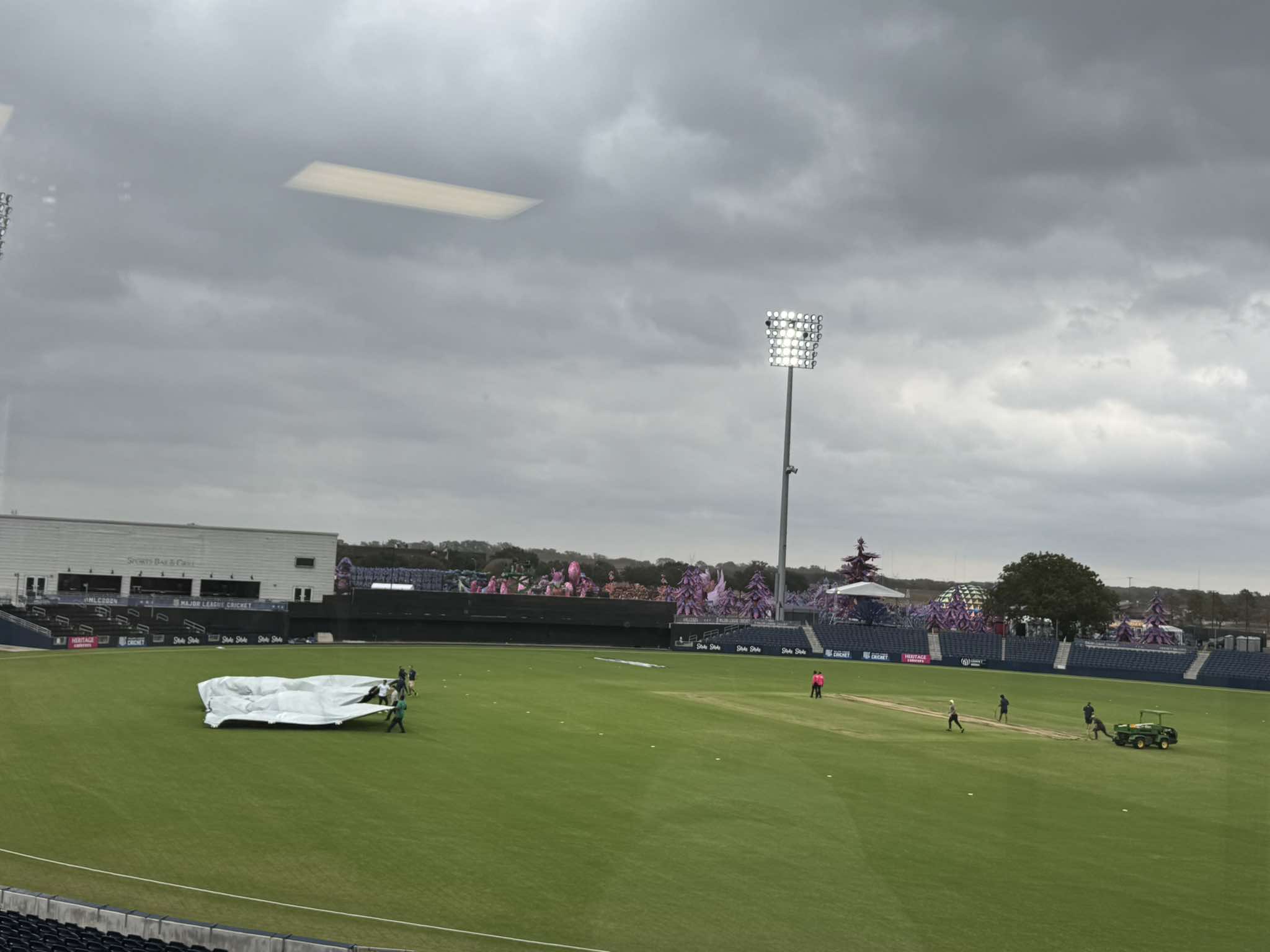 दुबै टोलीका खेलाडी डग आउटमा छन् । अम्पायर पनि मैदान बाहिर निस्केका छन् । डालसमा आज वर्षाको सम्भावना छ ।