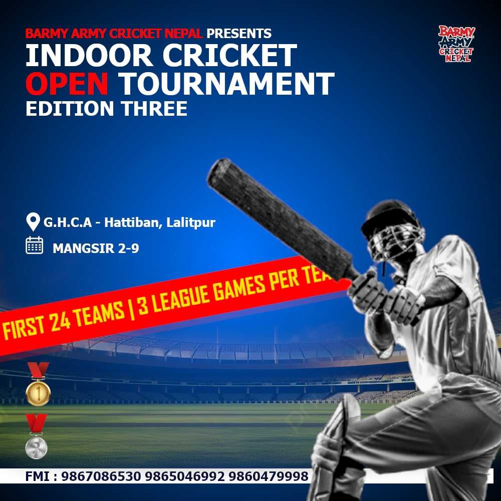 काठमाडौं (हाम्रो खेलकुद) – इंग्लिस क्रिकेट टोलीको समर्थक समूह बार्मी आर्मी क्रिकेट नेपालको आयोजनामा खुला इन्डोर क्रिकेट प्रतियोगिता आयोजना हुने भएको छ ।