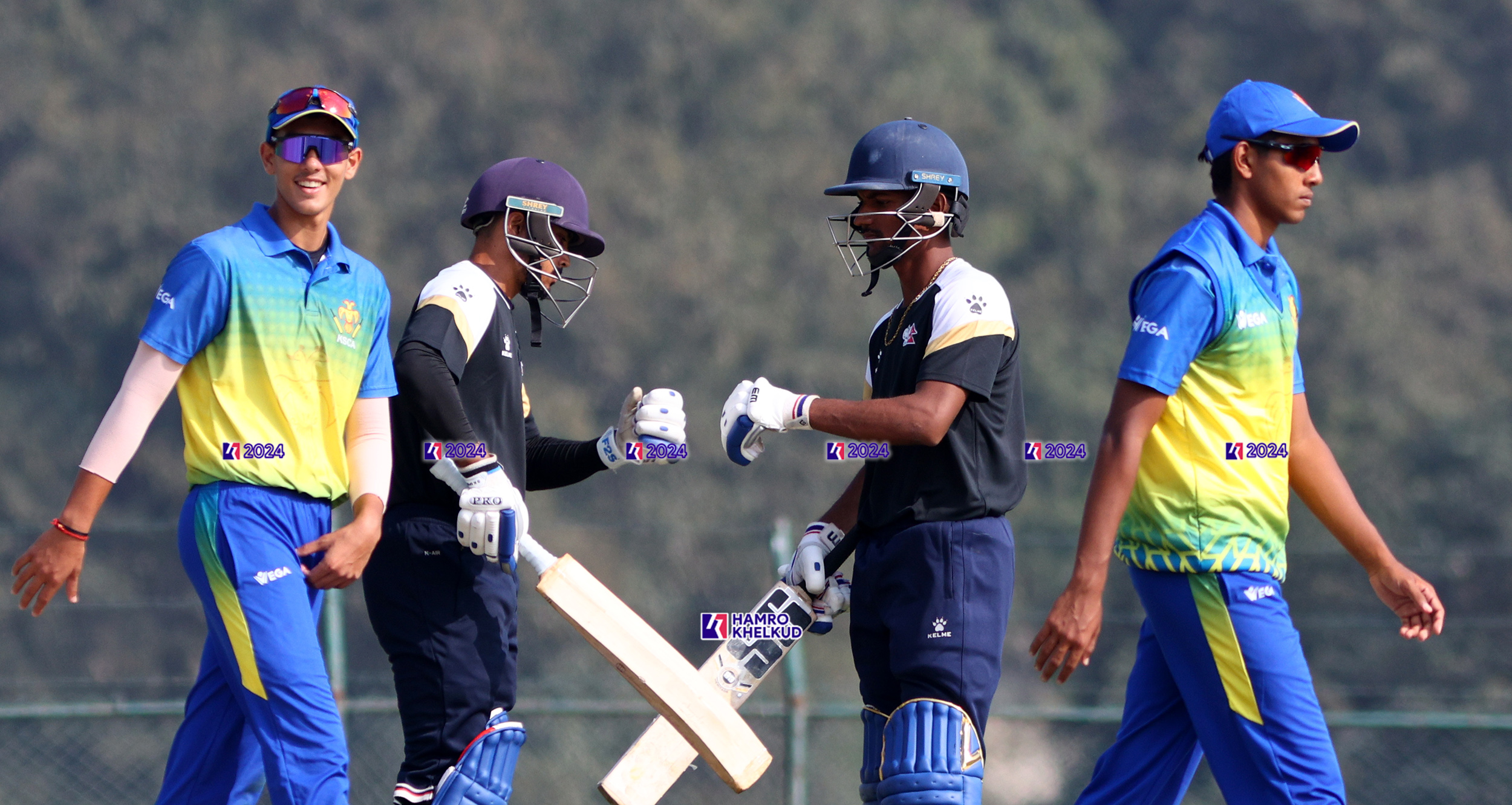 ओपनर प्रतिकले ३७ र रिशाभले ४० रन जोड्नुबाहेक अन्यले दोहोरो अंकमा रन जोड्न सकेनन । तेस्रो ओभरमा गगन राव२ रन जोड्दै दयानन्द मण्डलको एलबीडब्लु धरापमा परे । आठौं ओभरमा हेमन्तले शिभलाई ८ रनमा विकेटकिपरबाट क्याच गराए ।