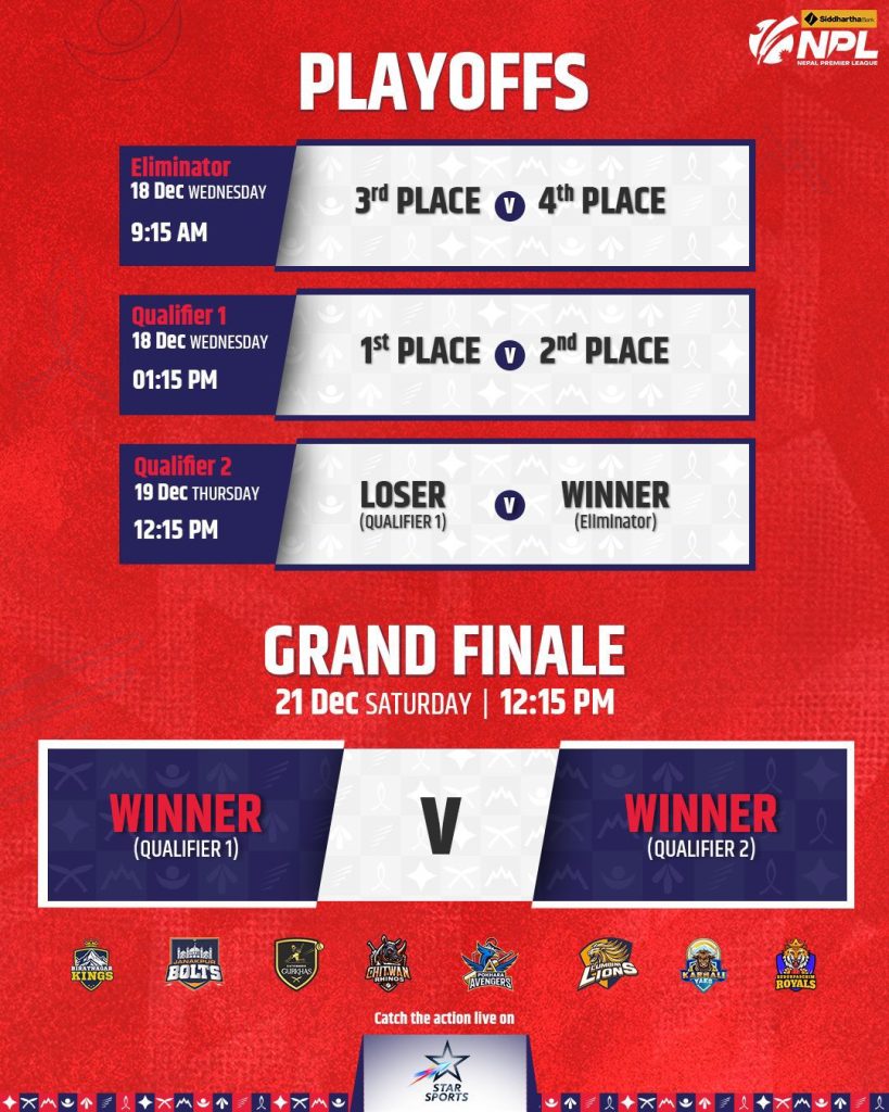 पुस ४ मा दोस्रो क्वालिफायर खेल हुनेछ । पहिलो क्वालिफायरमा पराजित टोली र इलिमिनेटर खेलमा विजयी टोलीबीच फाइनल प्रवेशका लागि खेल हुनेछ । पहिलो क्वालिफायरमा पराजित टाेली र दोस्रो क्वालिफायरको विजेताबीच पुस ६ गते पहिलो संस्करणको सिद्धार्थ बैंक एनपिएल उपाधीका लागि प्रतिस्पर्धा हुनेछ । फाइनल खेल पुस ६ गते मध्यान्ह १२ः१५ मा हुनेछ ।