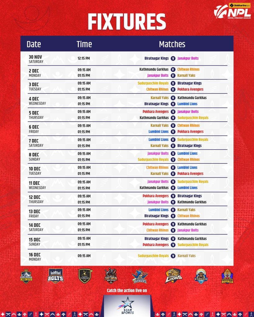 नेपाल क्रिकेट संघ(क्यान)ले सोमवार जारी गरेको खेल तालिका अनुसार उद्घाटन मंसिर १५ को दिन विराटनगरले जनकपुरको सामना गर्ने भएको हो ।