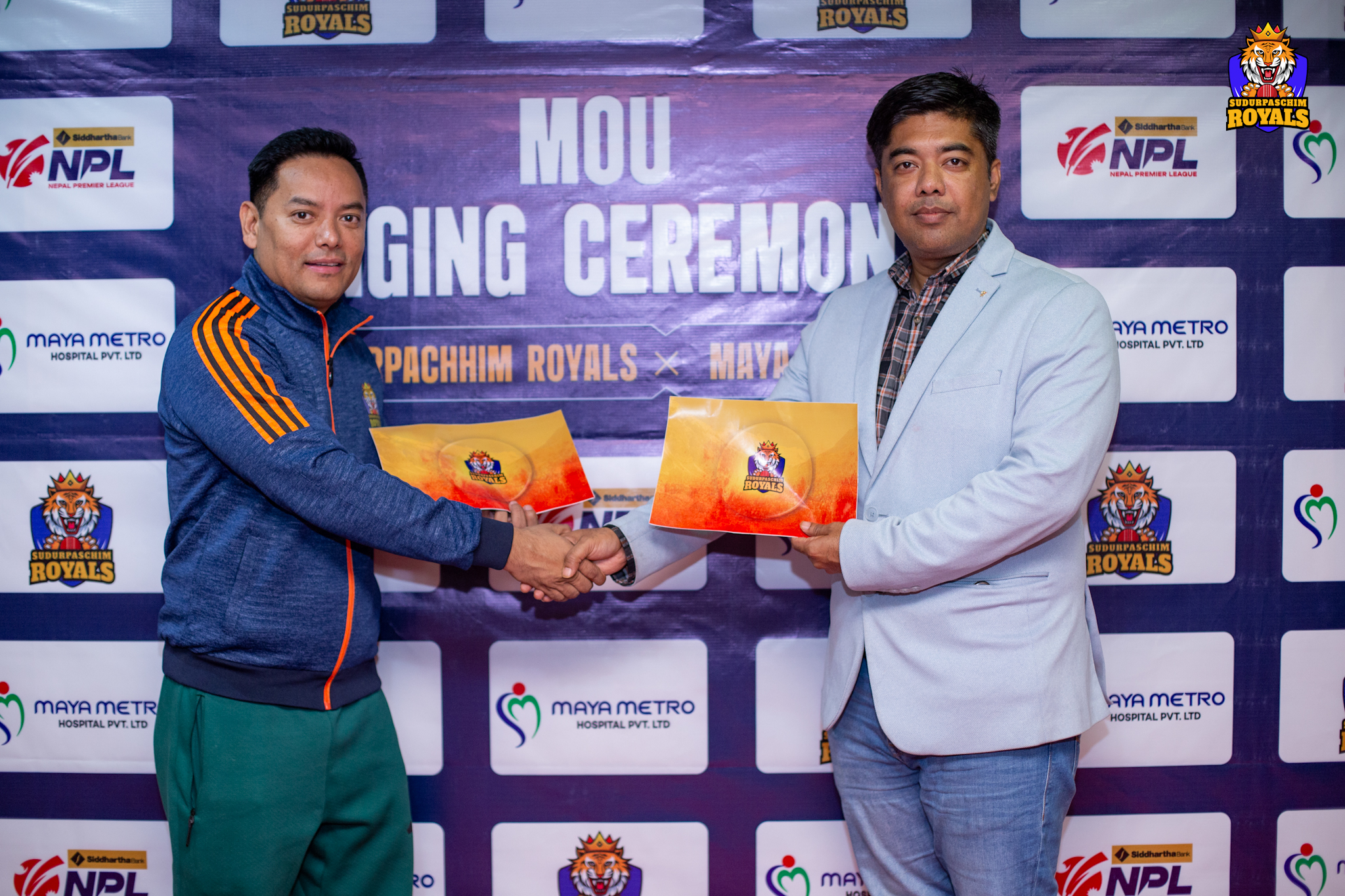 काठमाडौं ( हाम्रो खेलकुद)- सिद्धार्थ बैंक नेपाल प्रिमियर लिग (एनपिएल) टोली सुदुरपश्चिम रोयल्स र माया मेट्रो अस्पतालबीच प्रायोजन सम्झौता भएको छ ।