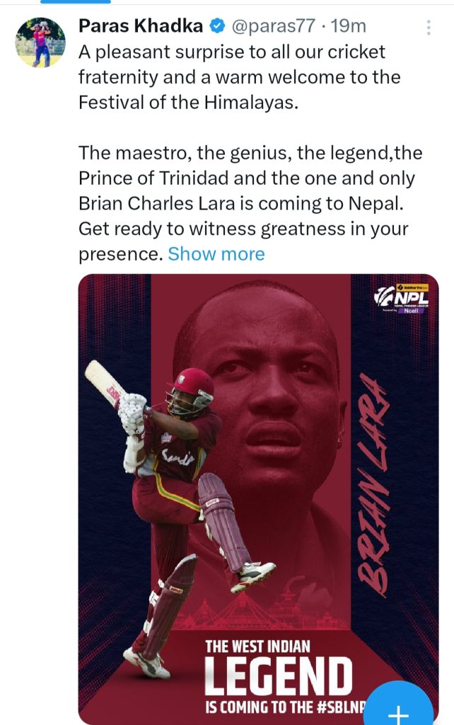 नेपाल क्रिकेट संघ (क्यान) का सचिव पारस खड्काले मंगलवार साँझ एक्समार्फत लारा नेपाल आउन लागेको बताएका छन्।