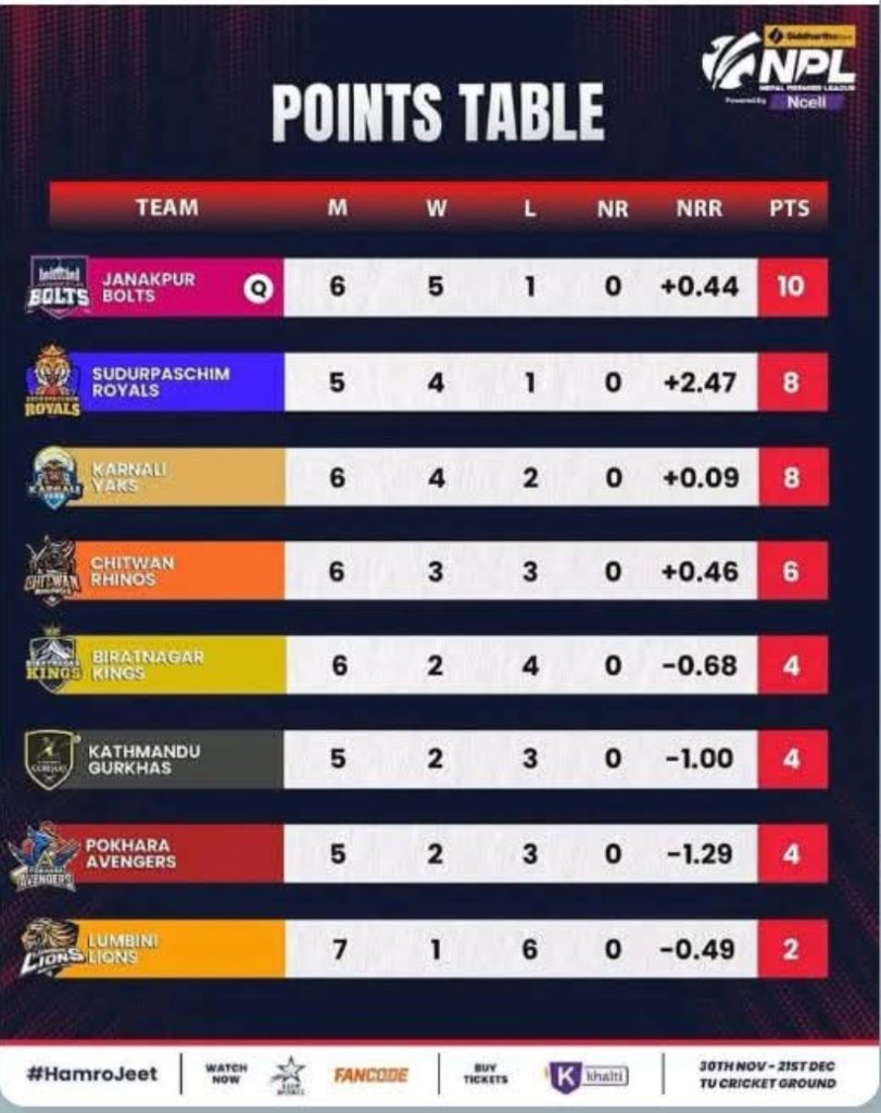 आइतवार २ तथा सोमवार १ खेलसँगै एनपिएलको पहिलो संस्करणको लिग चरणका खेल सकिनेछ ।