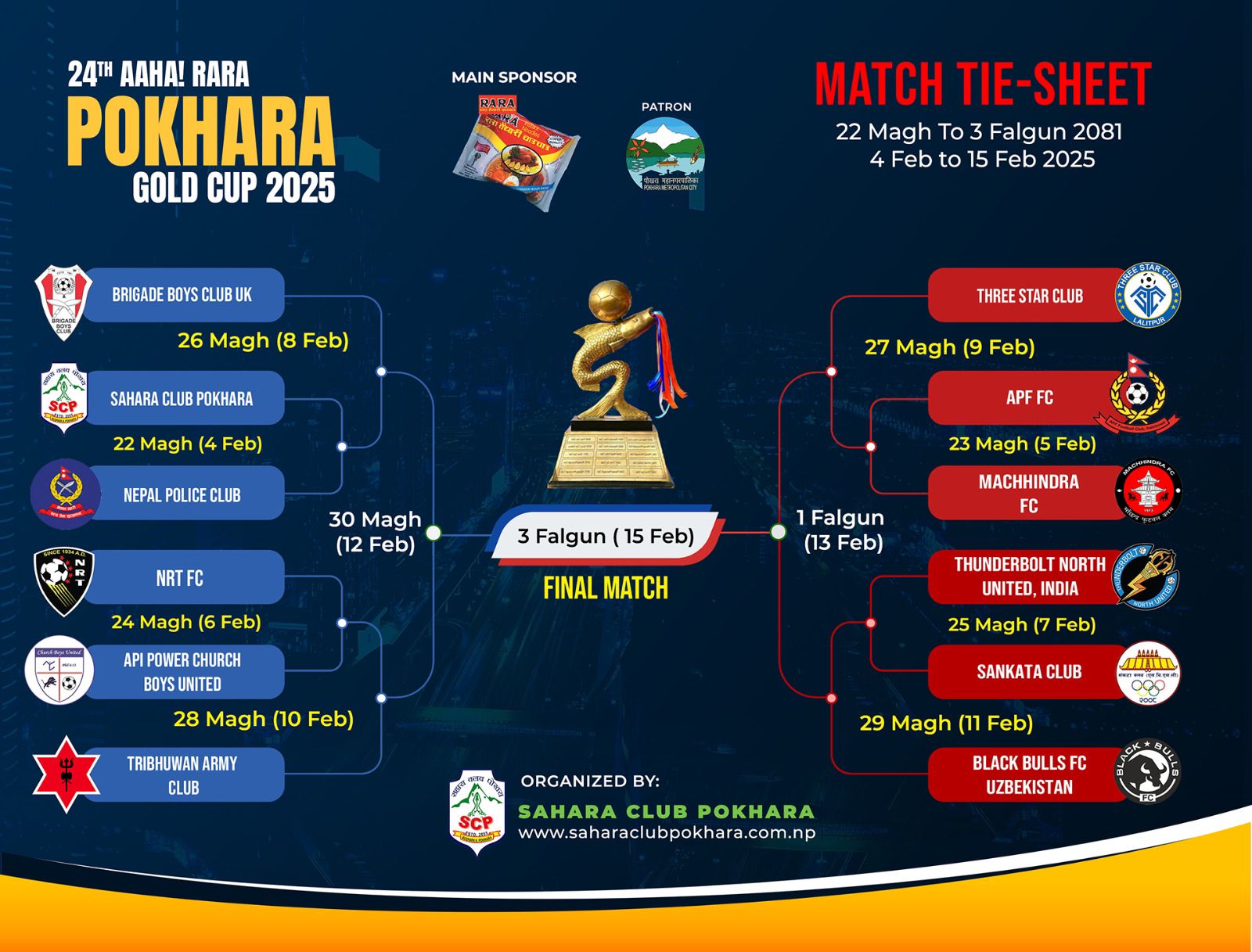 पोखरा (हाम्रो खेलकुद)- पोखरामा अर्को साता सुरु २४ औं आहा रारा पोखरा गोल्डकपको खेल तालिका सार्वजनिक भएको छ ।