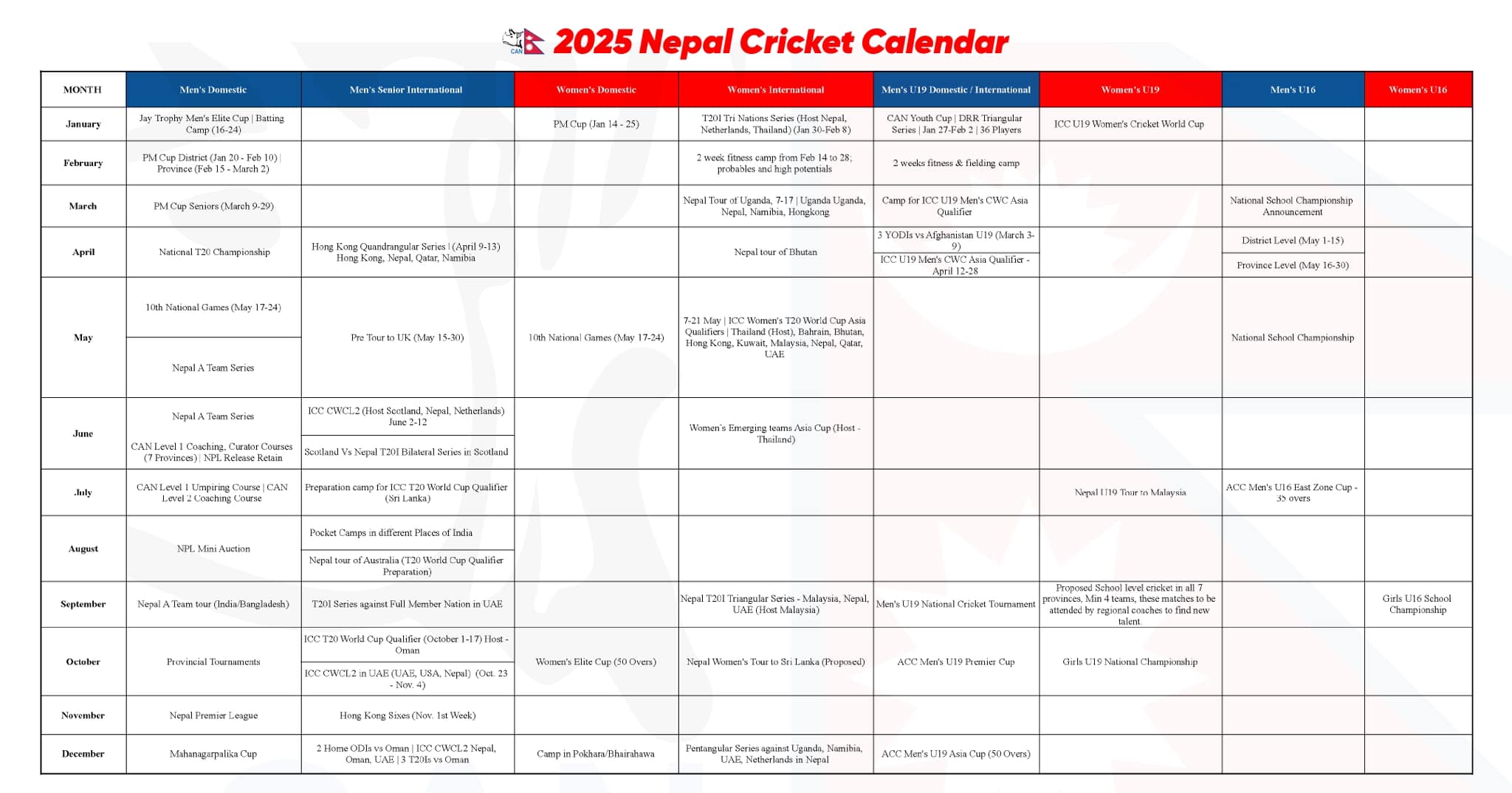 यो पटक यु-१९ टिमलाई पनि प्राथमिकताका साथ समेटिएको क्यानको भनाई छ। आईसीसी यु-१९ पुरुष विश्वकप एसिया छनोटलाई नै प्रमुख रूपमा लिइएको छ। तालिका यसप्रकार रहेको छ।