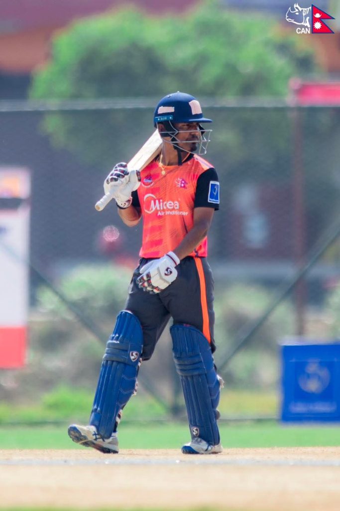 सम्राट भुसाल २३ बल खेल्दै ३ रनमा आउट भए। दोस्रो विकेटको लागि मृनाल गुरुङ र कप्तान देवले ५७ रनको साझेदारी गरे। यो क्रममा दुवैले अर्धशतक बनाए।