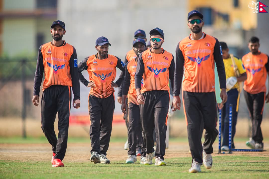 त्यसपछि कप्तान विपिन खत्री र सुदीप अर्यालले नवौं विकेटको लागि ४५ रनको साझेदारी गरे। अन्तिम ६ बलमा ९ रन जरुरी हुँदा विपिन अन्तिम ओभरको पहिलो बलमा विशाल पटेलको एलबिडब्लु धरापमा परे।