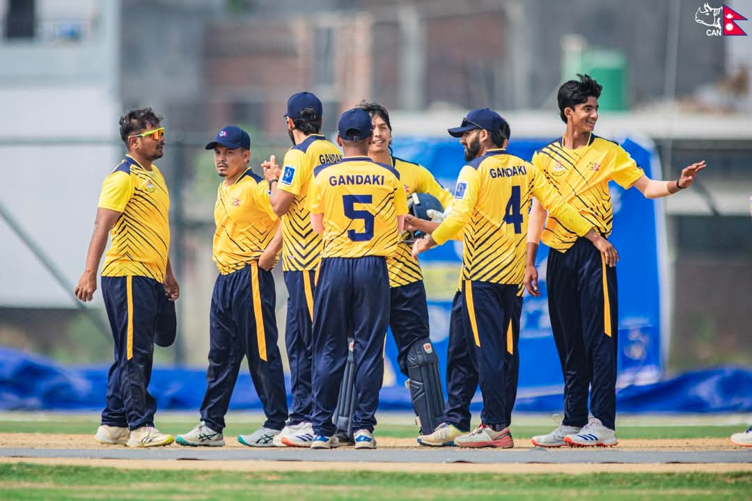 खराब सुरुवात गरेको गण्डकीले १६ रन जोड्दा ३ विकेट गुमायो। विशाल पटेलले सुरुवाती ३ विकेट लिए। उनले ओपनर मुस्कान थापालाई १ रनमा तथा दीपक डुम्रे र रोहित चन्दलाई विना कुनै रन पबिलियनको बाटो देखाए।