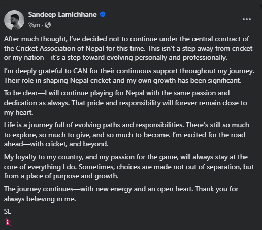 सामाजिक संजाल फेसबुकमार्फत सन्दीपले केन्द्रिय सम्झौतालाई निरन्तरता नदिने निर्णय घोषणा गरेका हुन् । उनले क्रिकेट र राष्ट्रबाट टाढिएको नभएर व्यक्तिगत र व्यावसायिक रुपमा अघि बढ्न यो कदम चालेको बताएका छन् । उनले क्यानलाई निरन्तर साथका लागि धन्यवाद समेत व्यक्त गरेका छन् । सन्दीपले आफू नेपालबाट भने निरन्तर खेल्ने प्रष्ट पारेका छन् ।