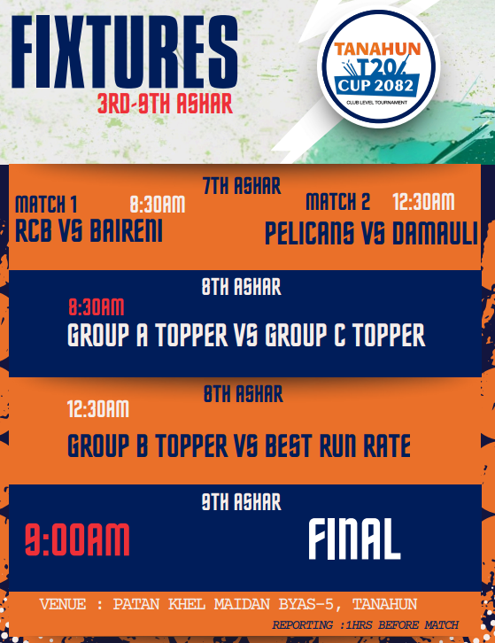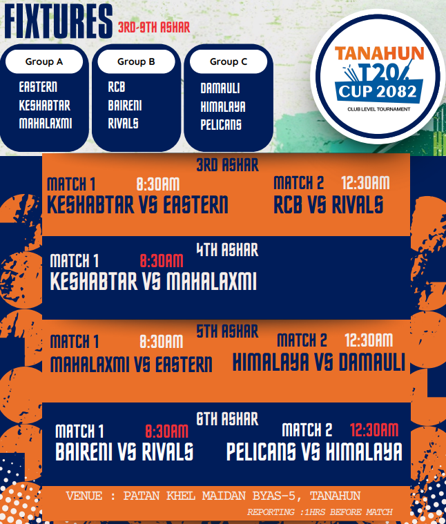 काठमाडौं (हाम्रो खेलकुद) – तनहुँ जिल्ला क्रिकेट संघको आयोजनामा पहिलो पटक तनहुँ टि२० क्रिकेट प्रतियोगिता २०८२ आयोजना हुने भएको छ ।