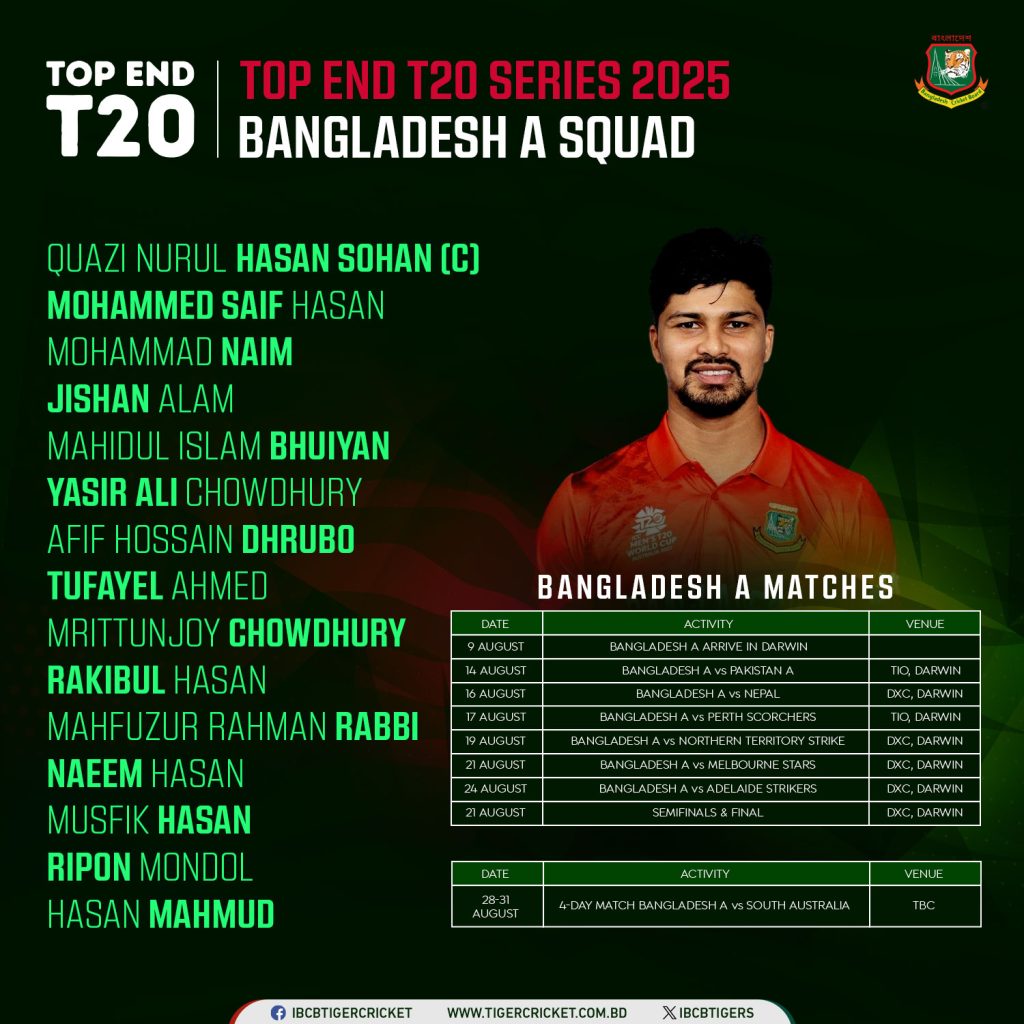 टोलीमा बंगलादेशका लागि तीनै फर्म्याटको क्रिकेट खेलेका खेलाडी छन् । नर्दन टेरिटोरी क्रिकेट अस्ट्रेलियाको आयोजनमा अगस्ट १४ देखि २४ सम्म हुने प्रतियोगितामा बंगलादेश ‘ए’ को पहिलो खेल पाकिस्तान ‘ए’ सँग छ ।